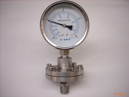 為使通用型壓力表能適用于測(cè)量強(qiáng)腐蝕、高溫、高粘度、易結(jié)晶、易凝固、有固體浮游物的介質(zhì)壓力以及必須避免測(cè)量介質(zhì)直接進(jìn)入通用型壓力儀表和防止沉淀物積聚且易清洗的場(chǎng)合,應(yīng)必須采用由隔膜隔離器與通用型壓力儀表組成一個(gè)系統(tǒng)的隔膜表。