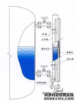 液位計根據浮力原理和磁性耦合作用研制而成。當被測容器中的液位升降時,液位計主導管中的浮子也隨之升降,浮子內的永久磁鋼通過磁耦合傳遞到現場指示器,驅動紅、白翻柱翻轉180。,當液位上升時,翻柱由白色轉為紅色,當液位下降時,翻柱由紅色轉為白色,指示器的紅、白界位處為容器內介質液位的實際高度,從而實現液位的指示。